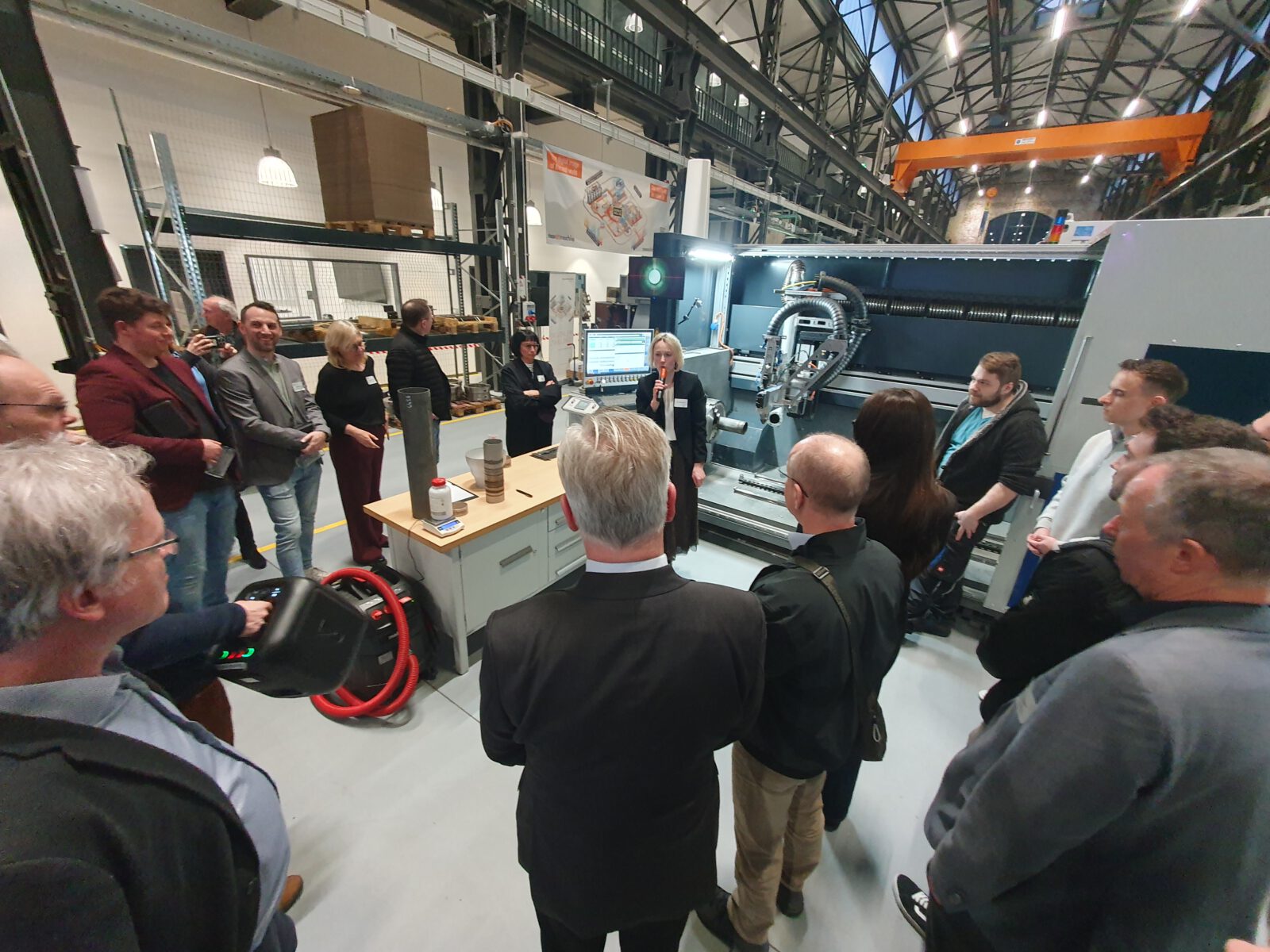 Am Campus Buschhütten in Kreuztal wurden wir durch Frau Dr. Gabriele Barten, Dr. hc. Axel Barten und Prof. Dr. Peter Burggräf begrüßt, die uns gemeinsam mit ihren Teams das REGIONALE-Projekt „GreenFactory“ vorstellten. In einer umgenutzten Industriehalle arbeiten sechs Lehrstühle der Universität Siegen gemeinsam mit inzwischen fast 100 Unternehmen an Themen der Digitalisierung, KI und Circular Economy.